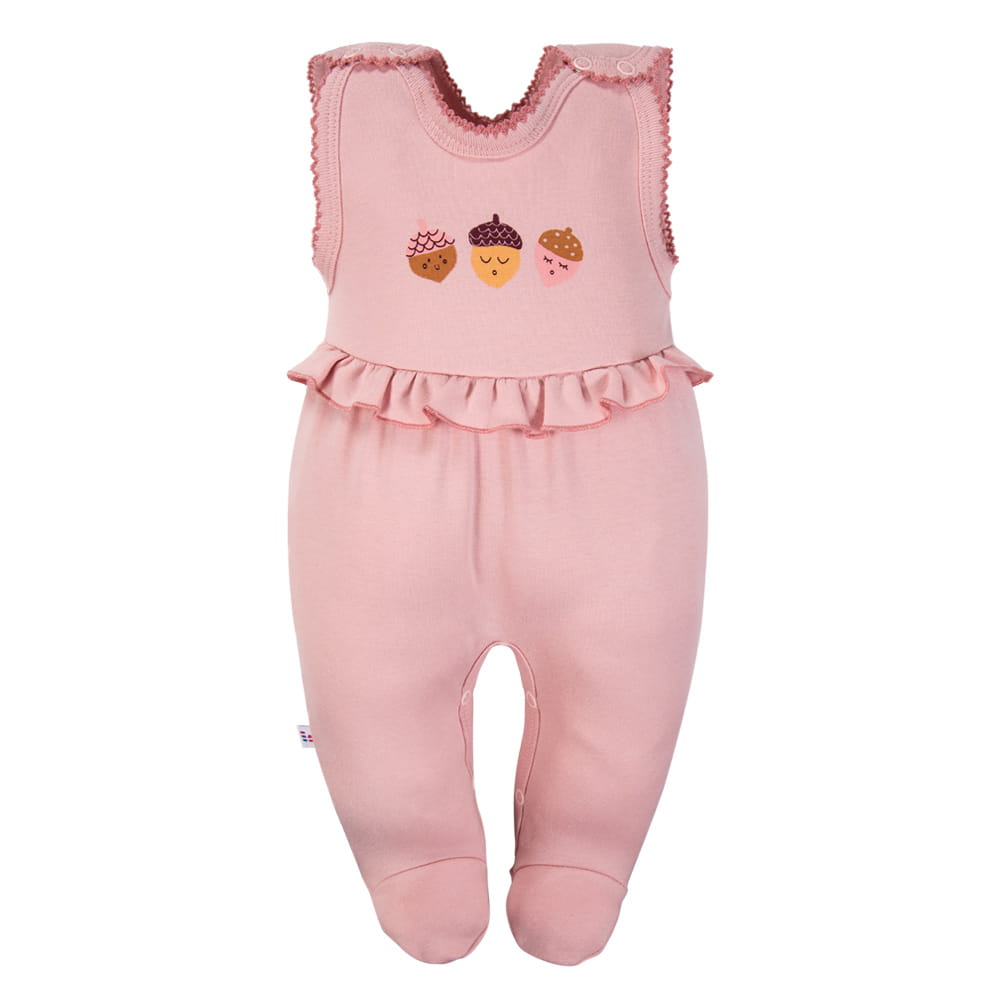 Pink baby rompers from the Fluffy Tails collection combine comfort and charm in one. Made from 100% natural cotton, they feature a delicate autumn acorn print. With a classic cut and convenient snap closure at the crotch, they are a practical addition to a baby's everyday wardrobe – perfect for both day and night.