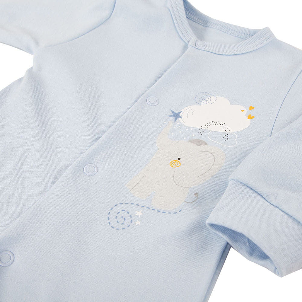 4-piece baby set from the Mellow collection is made from soft and pleasant-to-the-touch cotton knit fabric, ensuring comfort and safety for delicate baby skin. The set includes: body, footed joggers, baby sleepsuit, and hat. Decorative elements of the set feature cute prints: an elephant on the body and sleepsuit, clouds on the footed joggers, and a plain hat.