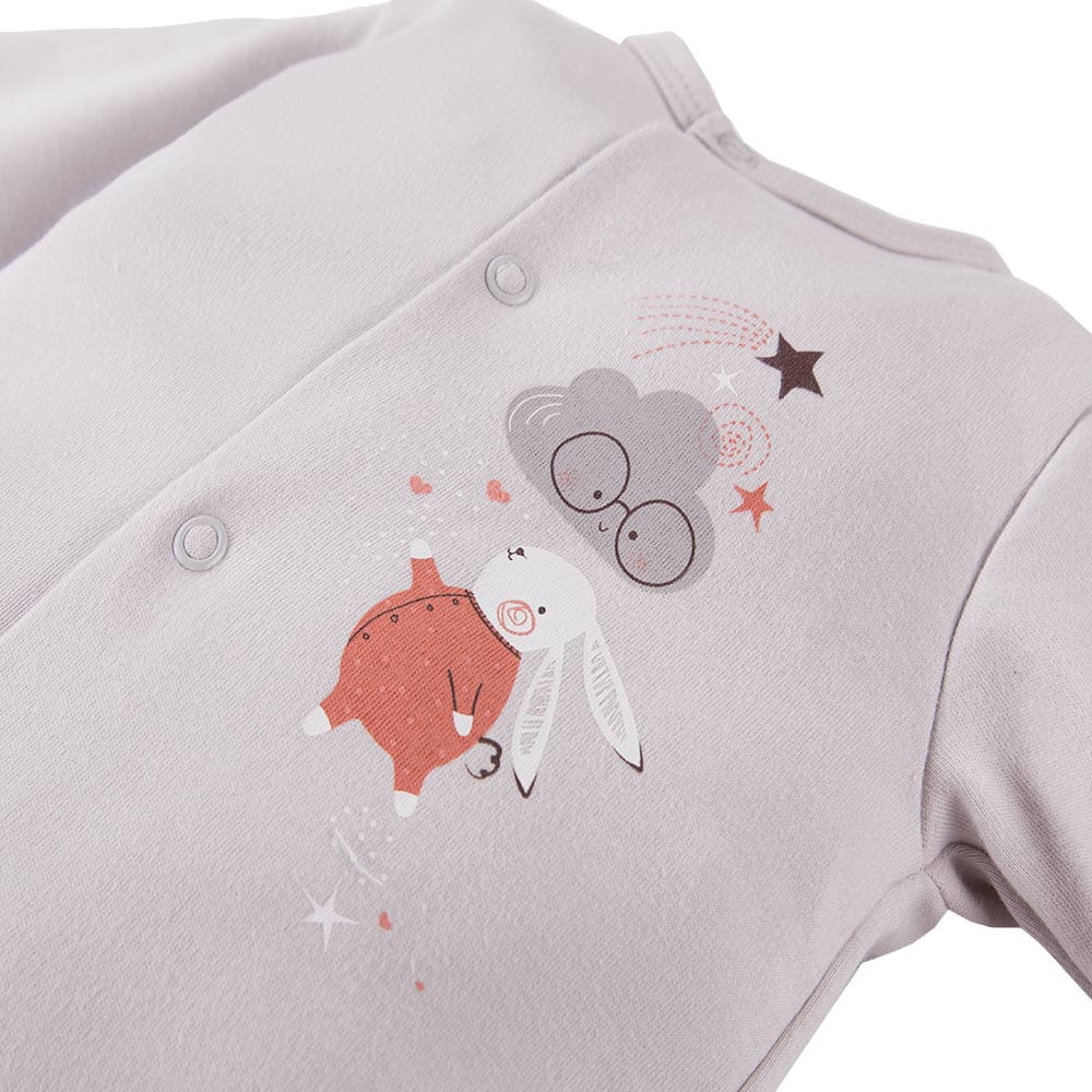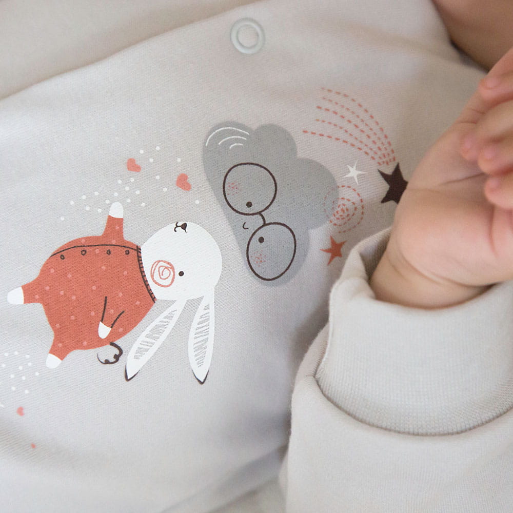 4-piece baby set from the Mellow collection is made from soft and pleasant-to-the-touch cotton knit fabric, ensuring comfort and safety for delicate baby skin. The set includes: body, footed joggers, baby sleepsuit, and hat. Decorative elements of the set feature cute prints: a bunny on the body and sleepsuit, clouds on the footed joggers, and a plain hat.