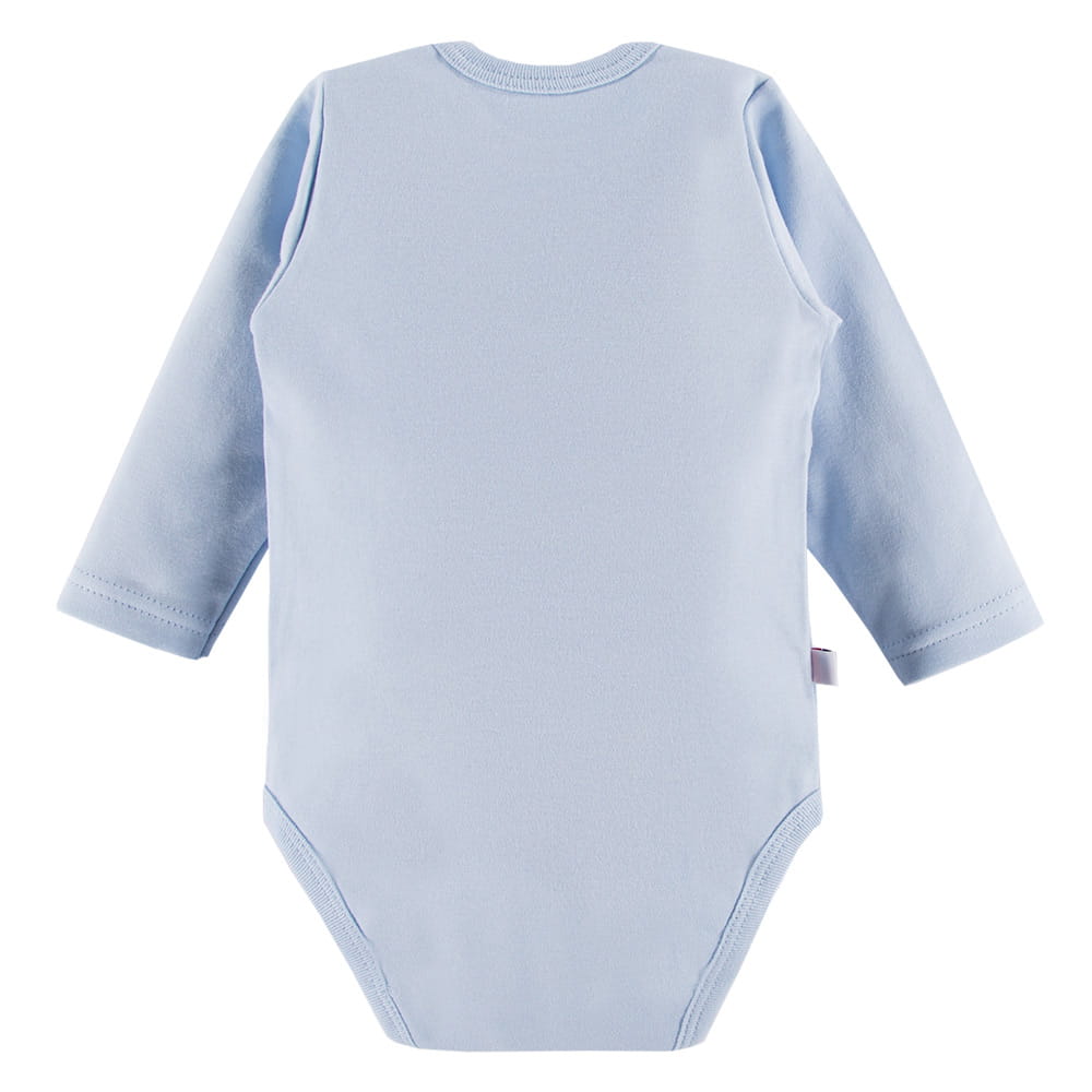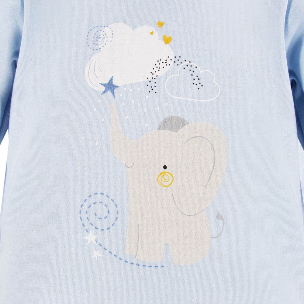Long-sleeve baby bodysuit from the Mellow collection in blue color is made from soft, pleasant-to-touch cotton fabric, ensuring comfort and safety for your baby's delicate skin. The front of the bodysuit features a cute elephant motif, adding a subtle and playful charm.