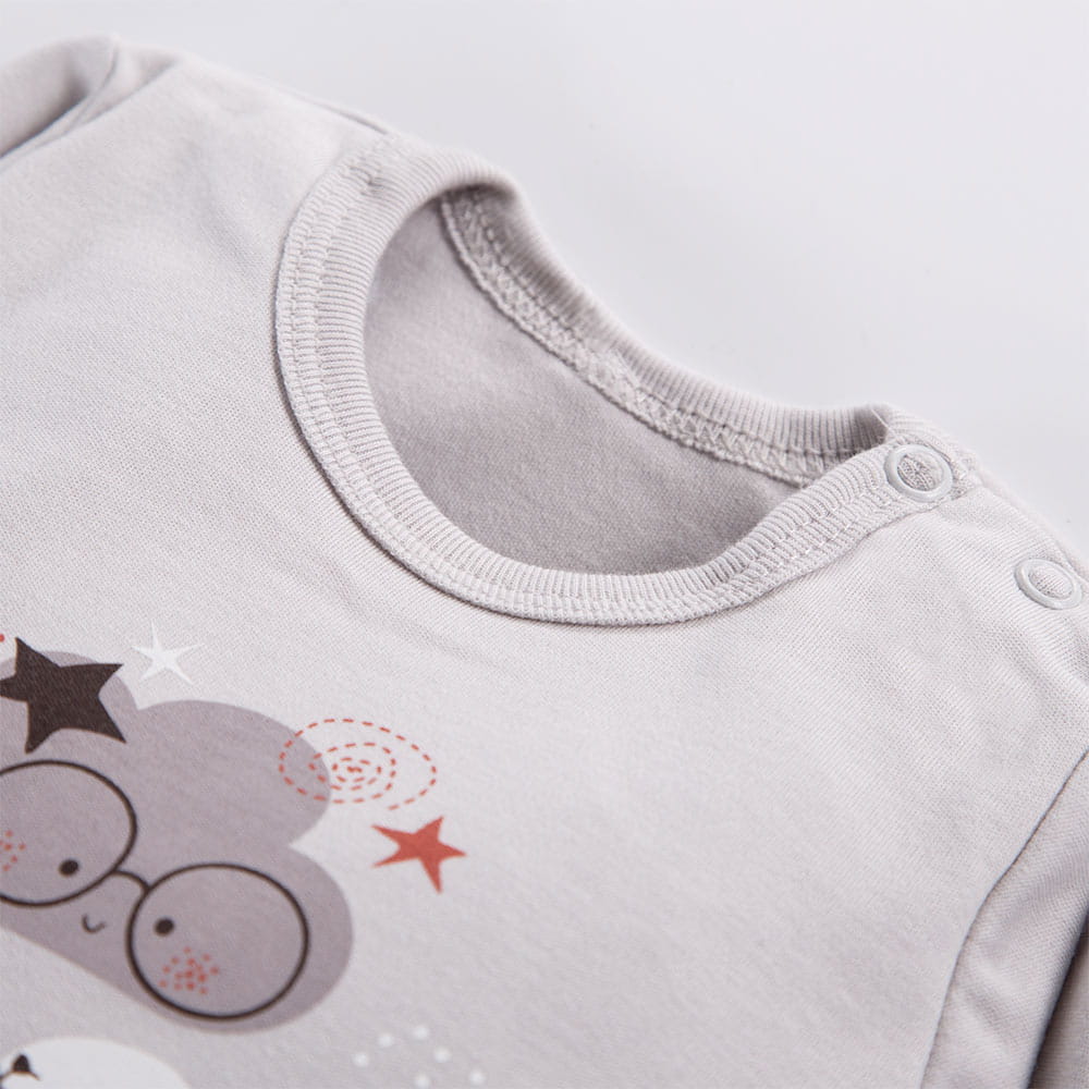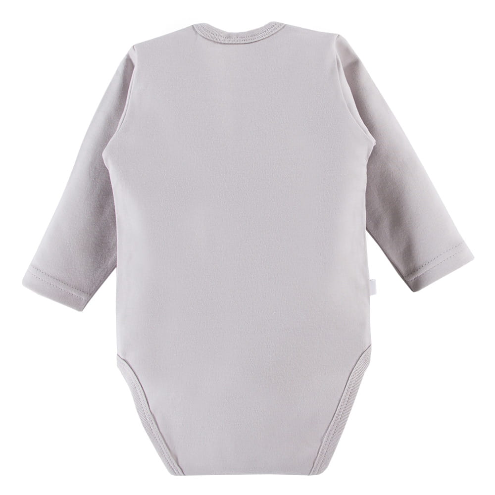 Long-sleeve baby bodysuit from the Mellow collection in gray color is made from soft, pleasant-to-touch cotton fabric, ensuring comfort and safety for your baby's delicate skin. The front of the bodysuit features a cute bunny motif, adding a subtle and playful charm.