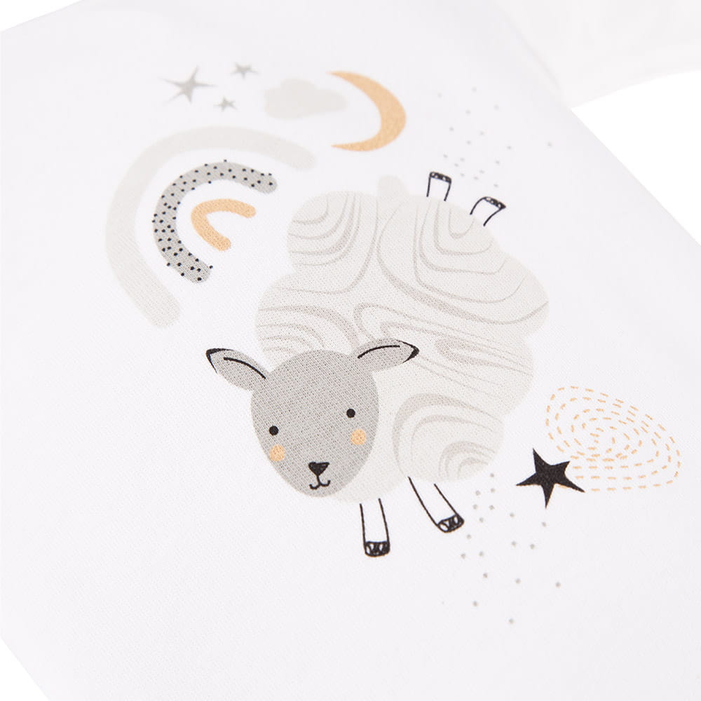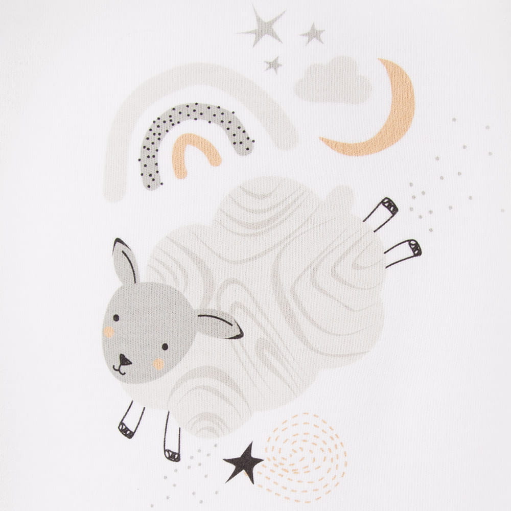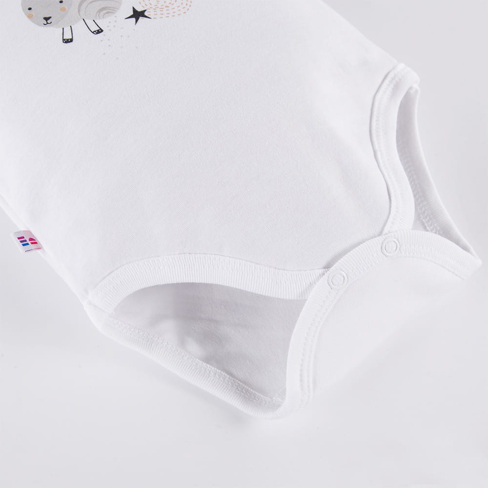 The front of the bodysuit features a cute animal print, giving it a gentle and child-friendly look. The functional design allows fastening at the shoulder and in the crotch, making dressing and diaper changing quick and easy.