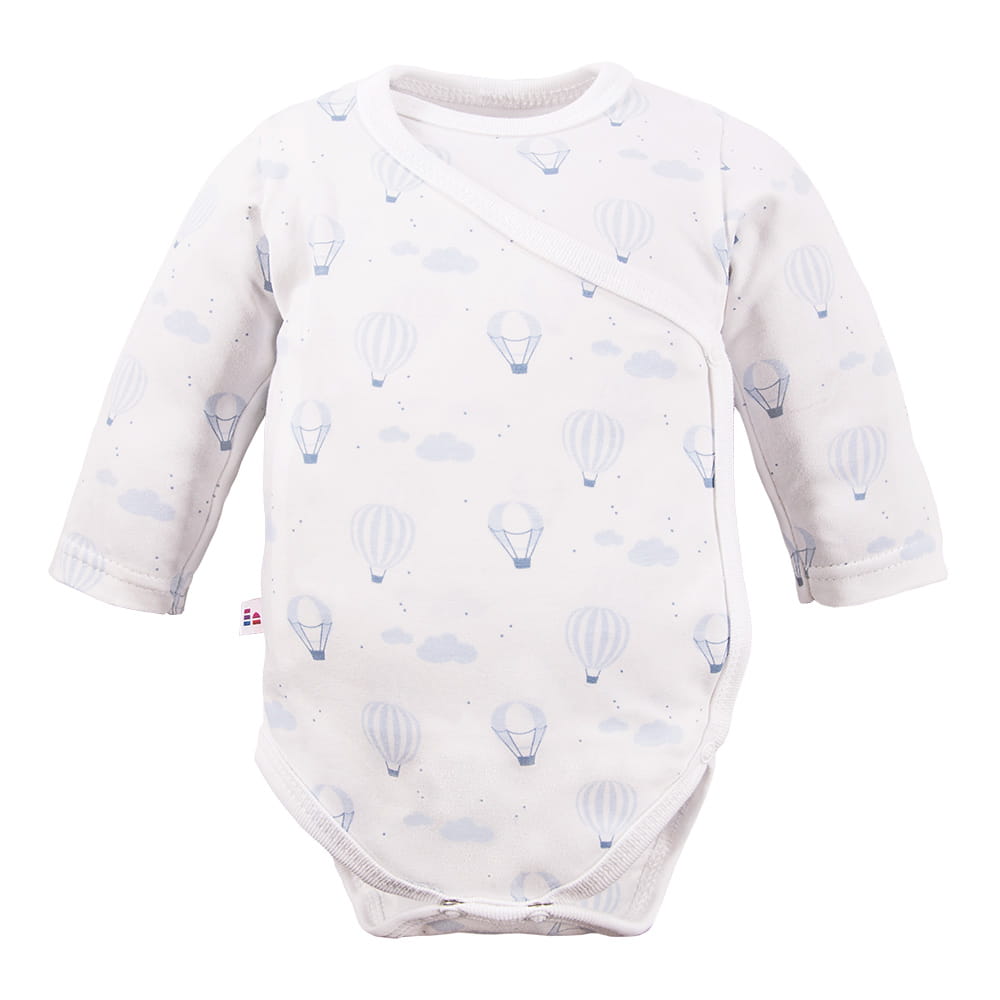 White wrap-style bodysuit with long sleeves decorated with a cute balloon pattern is a perfect choice for babies in their first months of life. The delicate design adds lightness and charming style.