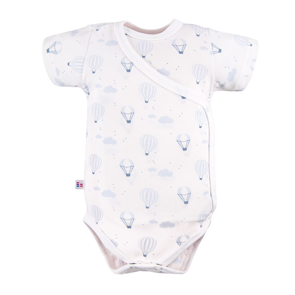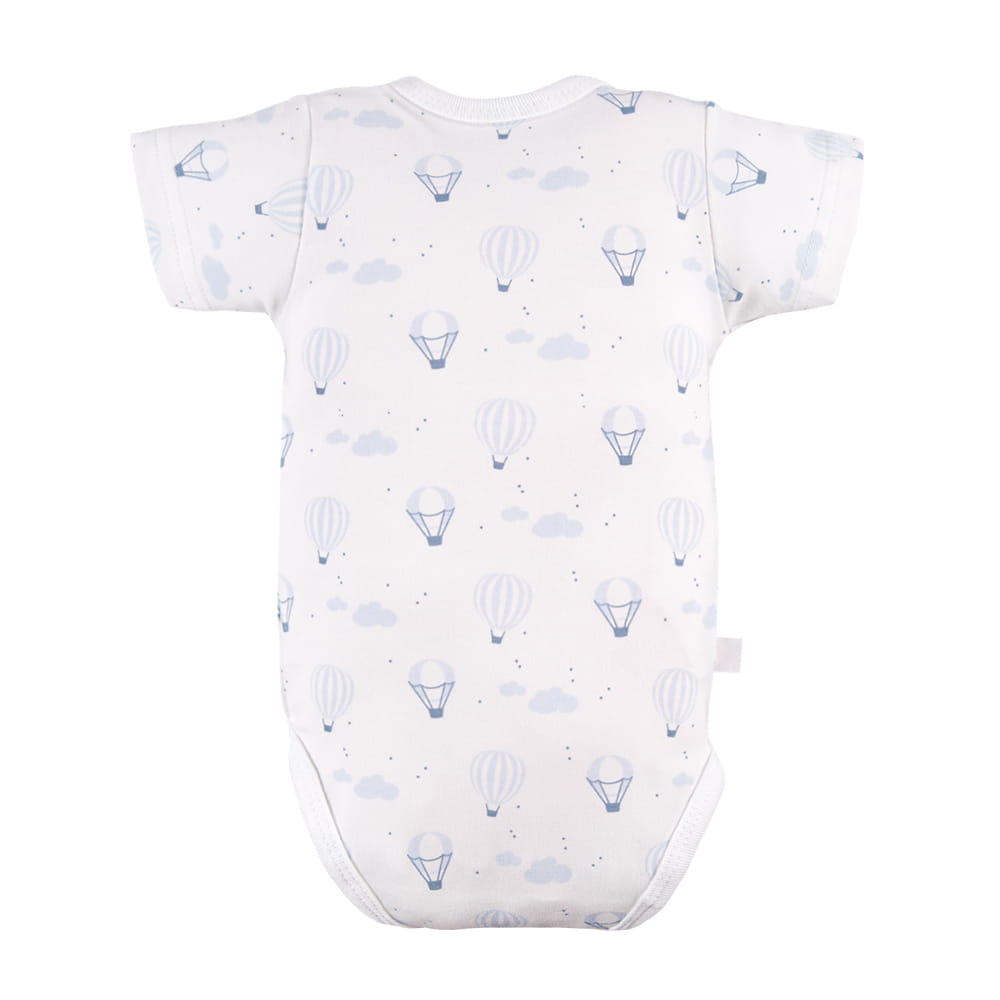White wrap baby bodysuit with short sleeves featuring balloons is a comfortable and practical choice for infants in their first months. The delicate balloon pattern gives the outfit a cheerful, childlike charm.