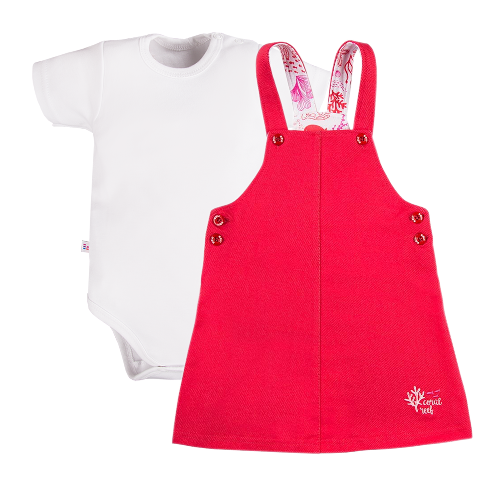 Girls’ set from the Coral Reef collection is a stylish and comfortable choice for summer. The set includes a coral dress overall and a classic white short sleeve bodysuit.
