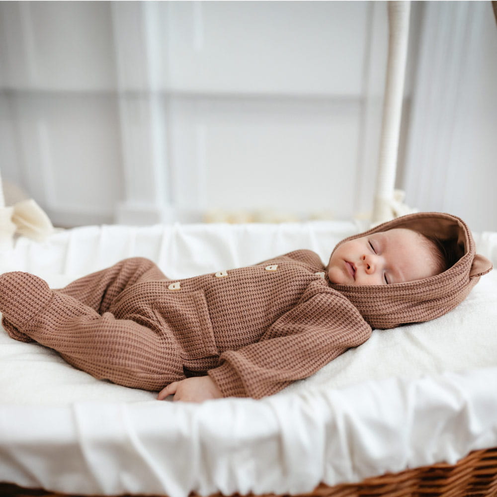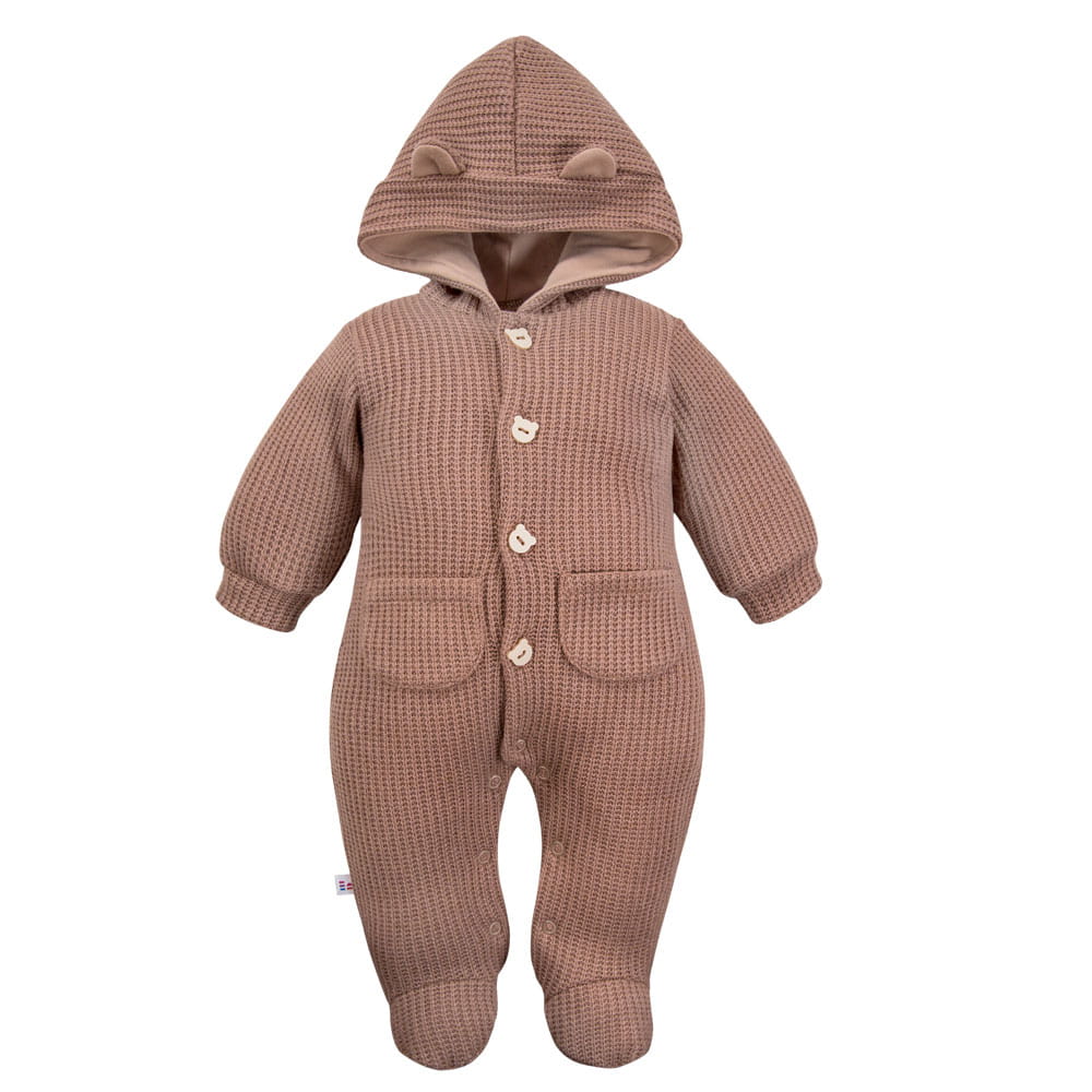 Stylish and cozy sweater-style baby overall with a hood from the Beary Cool collection, perfect for cooler days. Made from soft fabric with a fashionable waffle knit, it not only looks great but also ensures comfort. The practical design features long sleeves, built-in feet, and a front button closure, making dressing your little one easy. The hood adds charm while keeping the baby’s head warm.