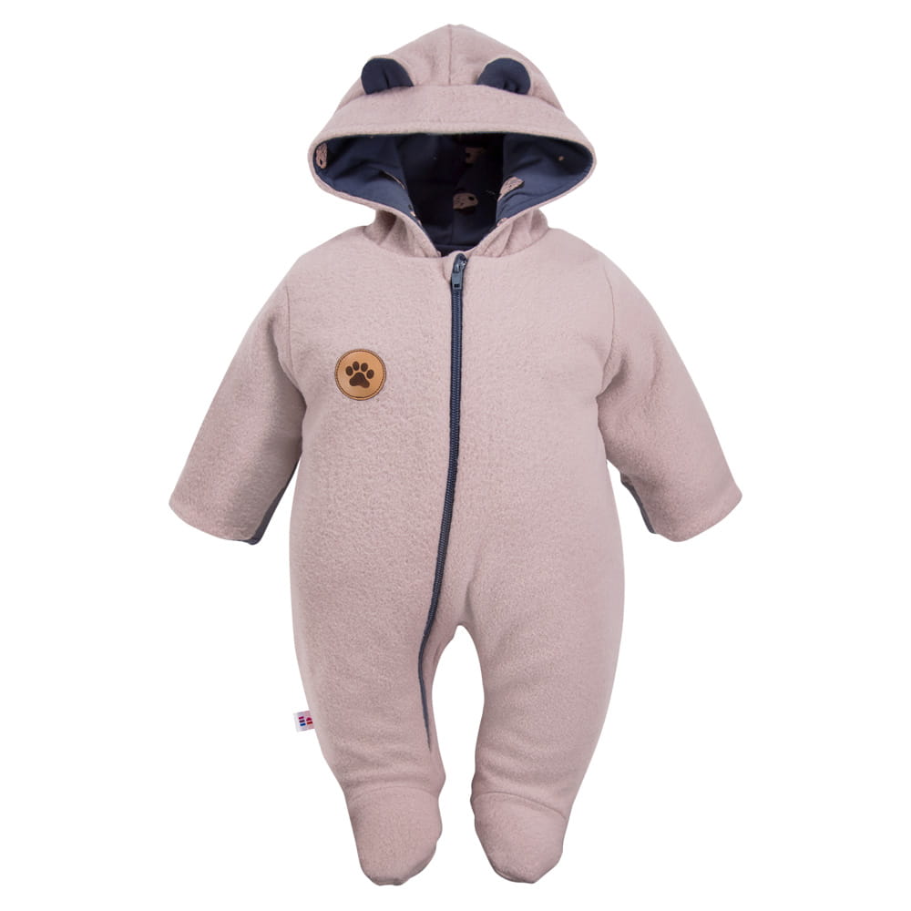 The beige baby hooded jumpsuit is a stylish and practical choice for cooler autumn and winter days. Made from soft, warm fleece, it provides excellent protection from the cold and comfort from the very first days of life.