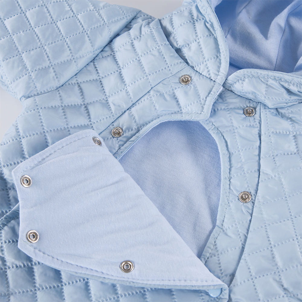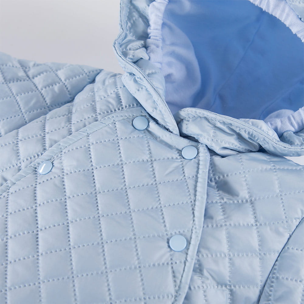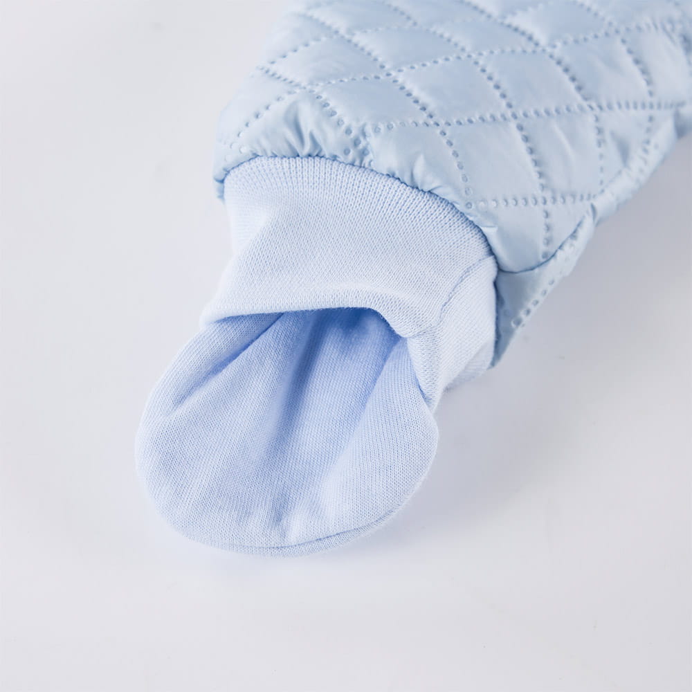 Baby jumpsuit with feet The jumpsuit will be perfect for winter days. Made of clothing fabric that perfectly protects the child against cold, rain and wind. It has an additional layer of undersuit. The inside is lined with cotton. An elastic band is sewn in the hood of the suit, which prevents the hood from coming off and protects the baby's head from the cold. The suit is fastened with press studs.