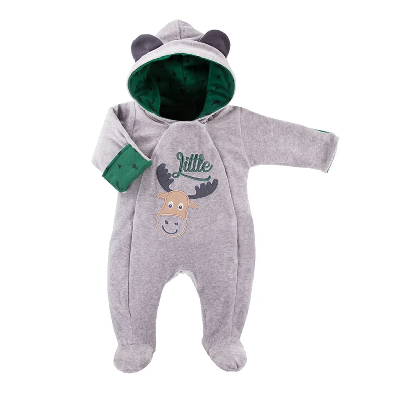 Hooded playsuit from TRIP collection made from soft and pleasant to the touch velvet fabric. There is an embroidery at the front. The cut allows for a full opening, making the clothes functional and comfortable. The sleeves are finished with cotton welts. Baby velvet playsuits are perfect for the first months of a child's life. They are warm, they will be perfect clothes for a walk. We can put them on a cotton sleepsuit or body and pants.