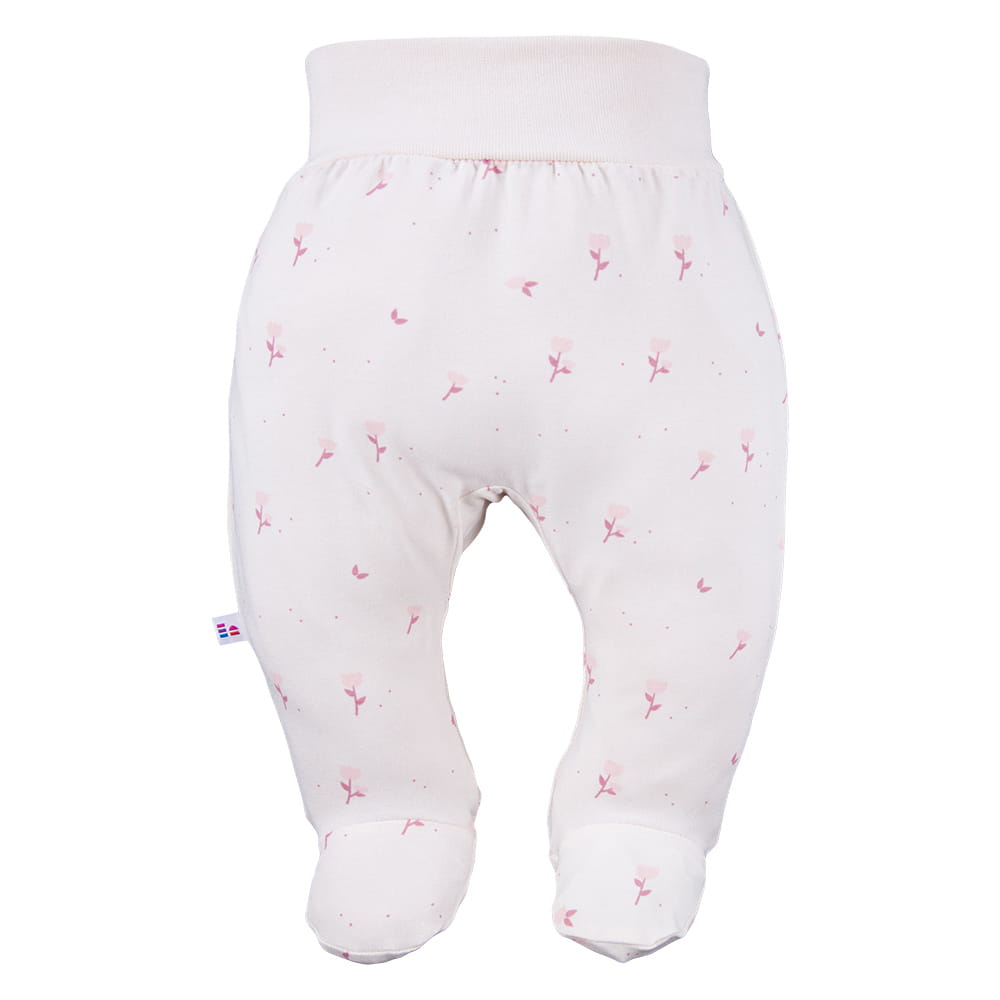 Cream baby footed joggers with a flower pattern are perfect for any season. They are suitable for babies born in winter or summer. Exposed feet are a common problem for parents – socks slip off, so parents make sure that the baby's feet stay warm and protected from the cold. These joggers provide comfort and freedom of movement.