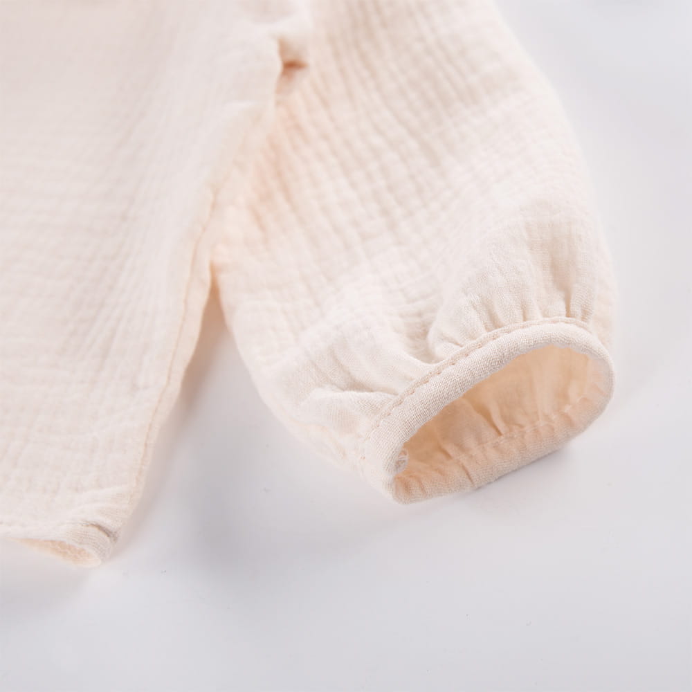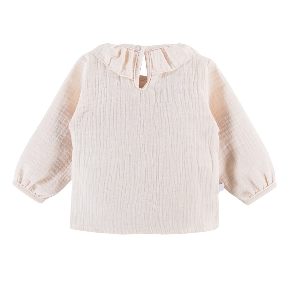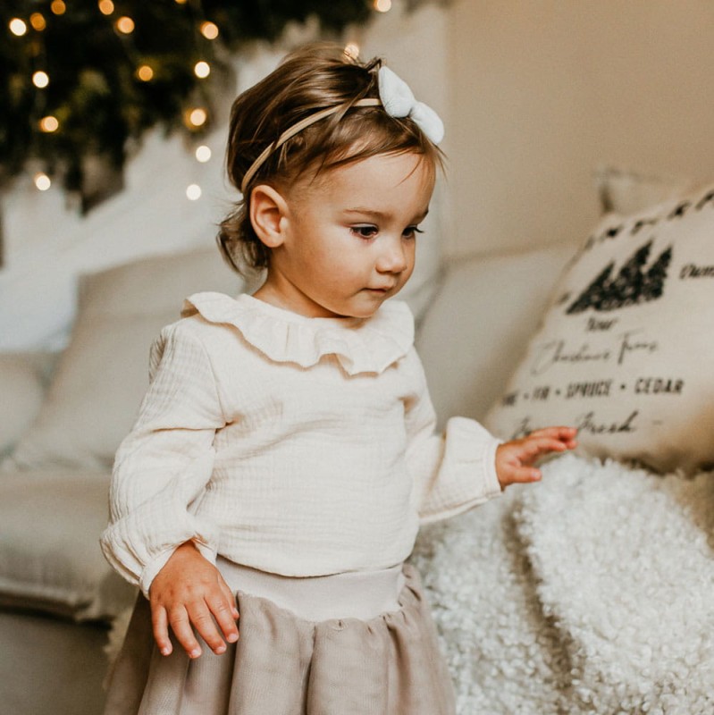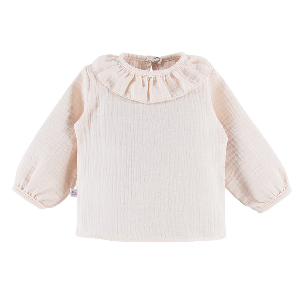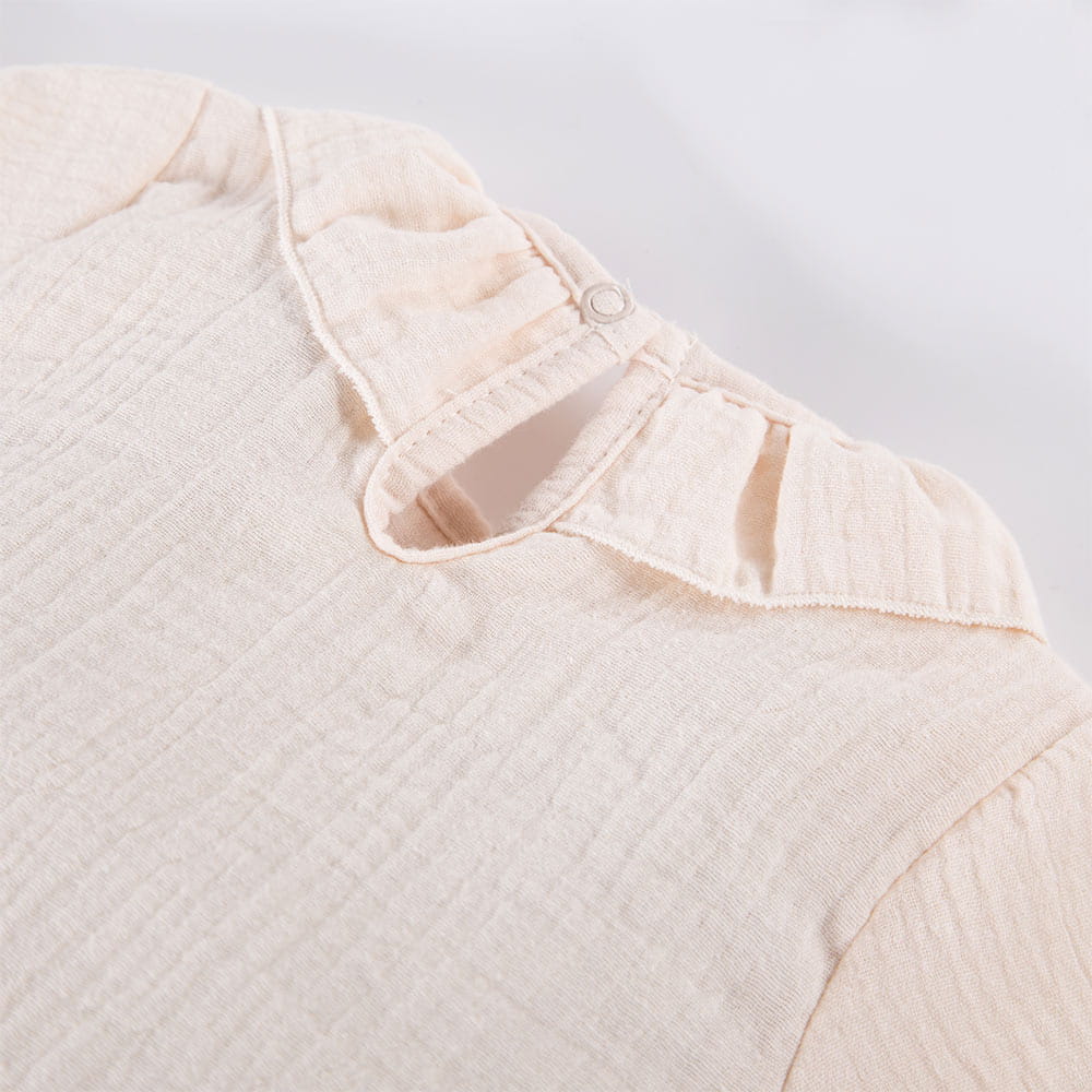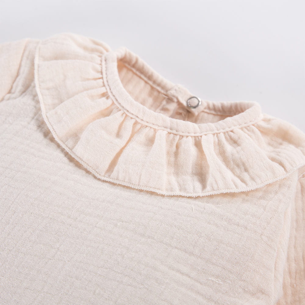 Children's Muslin Blouse. An adorable ruffle serves as a decorative element. The blouse is exceptionally elegant and can be paired with a tulle skirt or suspenders skirt from the same collection. This blouse is perfect for elegant gatherings or upcoming holidays.