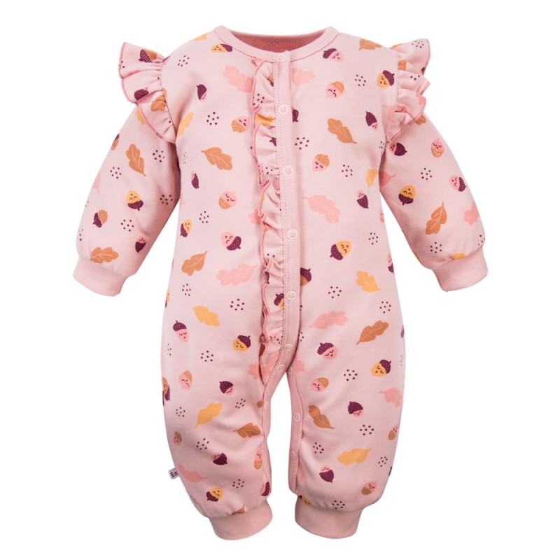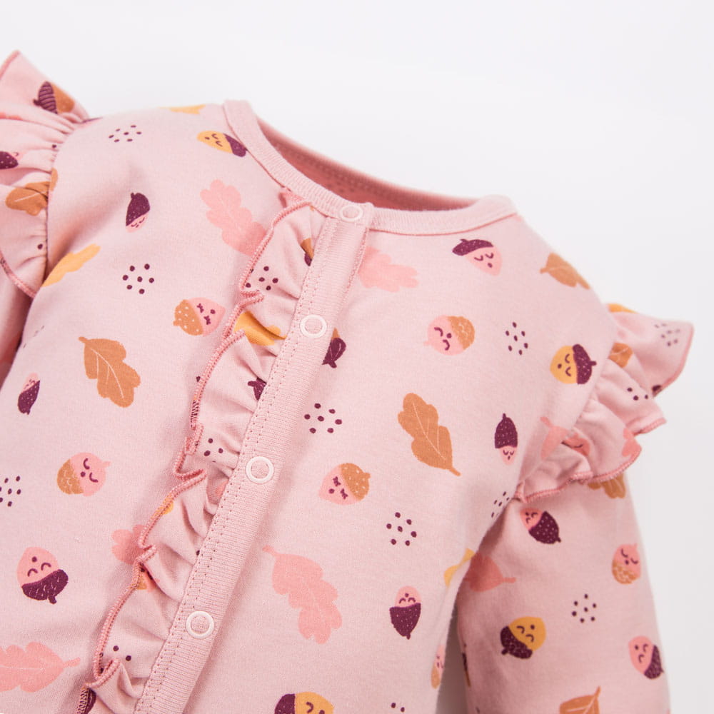 Pink baby sleepsuit without feet with leaves and acorns