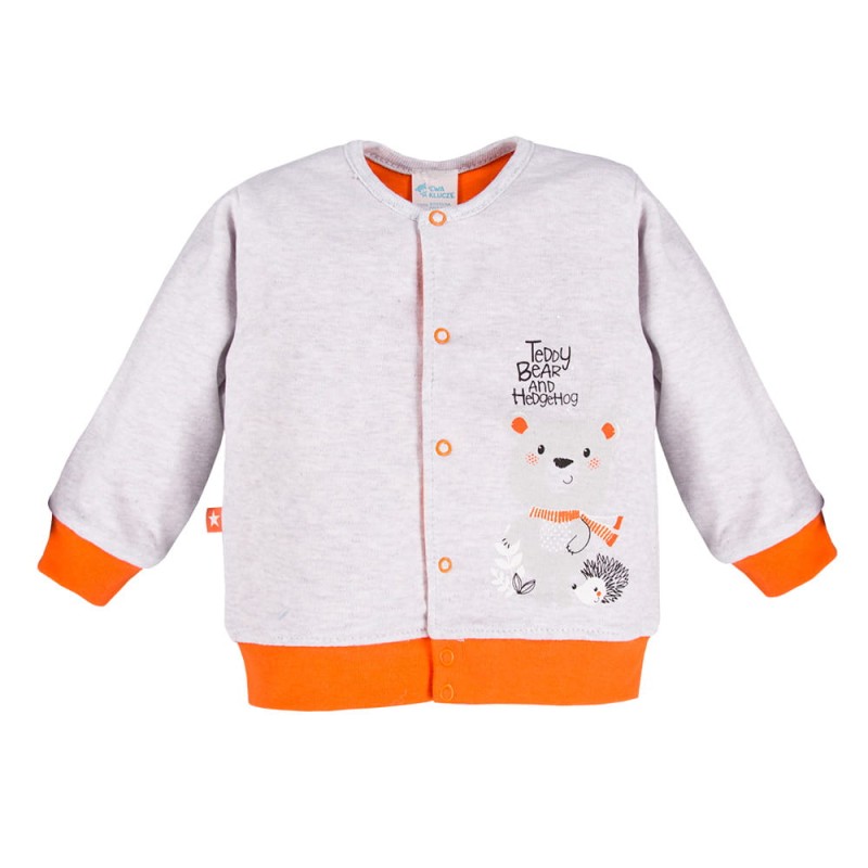 Sweatshirt from the "Forest" collection made from soft and pleasant to the touch mélange knitted fabric in four pastel colors. Lining and welts nicely contrast with a strong color giving it a look. The cut allows complete unhooking, which makes the baby’s clothing functional and comfortable. At the neck the sweatshirt is finished with a soft piping. On the prints, made with ecological paints, we can find four nice, forest animas. Snaps used in our products do not contain nickel. Made in Poland, certified "Safe for Children". 100% Cotton