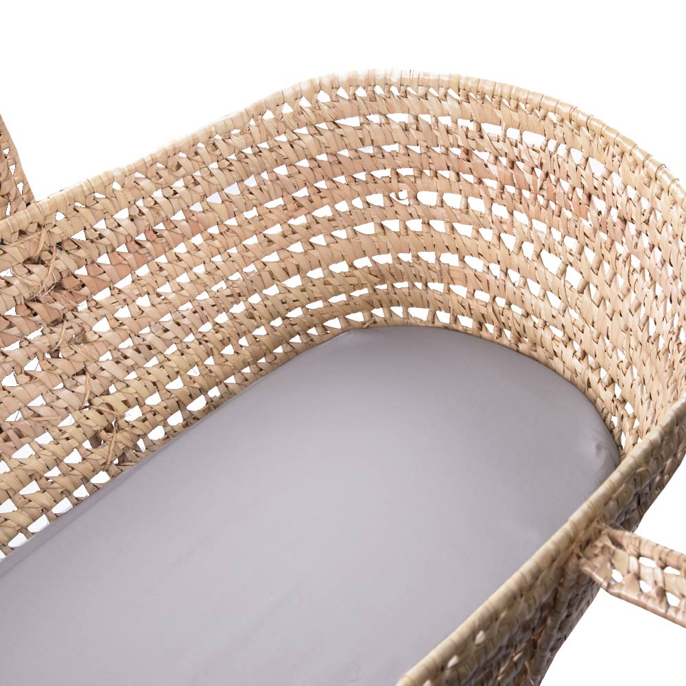 Cotton fitted sheet for a pram bassinet or Moses basket in universal gray is a practical element of a newborn layette. Made from 100% high-quality cotton, it is soft, breathable and gentle on a baby’s delicate skin.