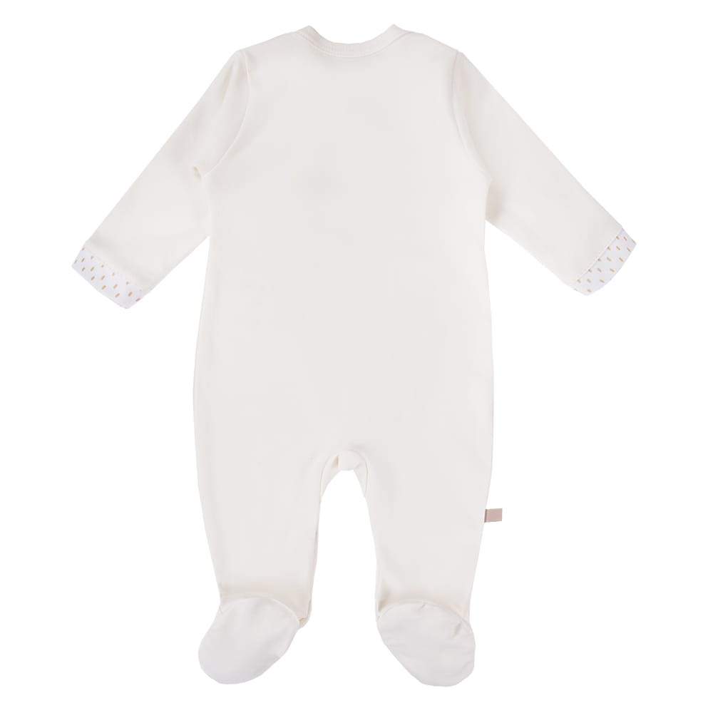 On the front, there is a cute puppy embroidery, secured on the inside to avoid irritating the baby’s delicate skin. The sleepsuit features a functional design with full-length snaps, making dressing and diaper changes easy. Sleeves are finished with cuffs with delicate prints, and soft trimming ensures extra comfort.