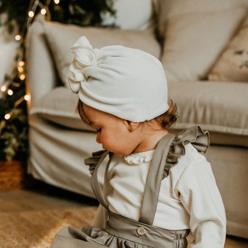 Girl's Turban from the Ceremony collection, made from soft and pleasant to touch velvet. The turban is thicker than our standard jersey and will be perfect for autumn or winter. The cut and elastic material allow for easy dressing of the baby. The children's turban is very comfortable and fashionable. Every mother knows that for some babies, head coverings are not the most pleasant part of clothing, so it's worth choosing a head covering that is comfortable but also safe for the delicate skin of the child.