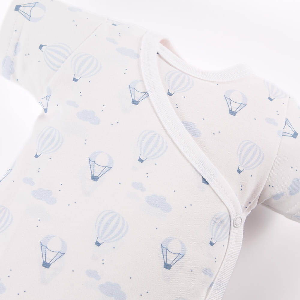 Białe body kopertowe w balony z krótkim rękawem to wygodna i funkcjonalna propozycja dla niemowląt w pierwszych miesiącach życia. Delikatny wzór balonów nadaje ubranku radosny, dziecięcy charakter.