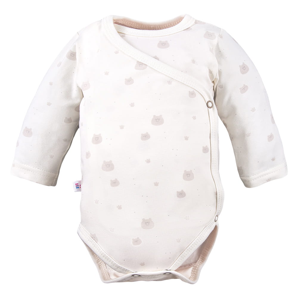 Ecru kopertowe body z długim rękawem z uroczym misiowym wzorem na całej powierzchni to funkcjonalna i wygodna propozycja dla niemowląt w pierwszych miesiącach życia. Delikatny motyw misiów nadaje ubranku uroczy i dziecięcy charakter.