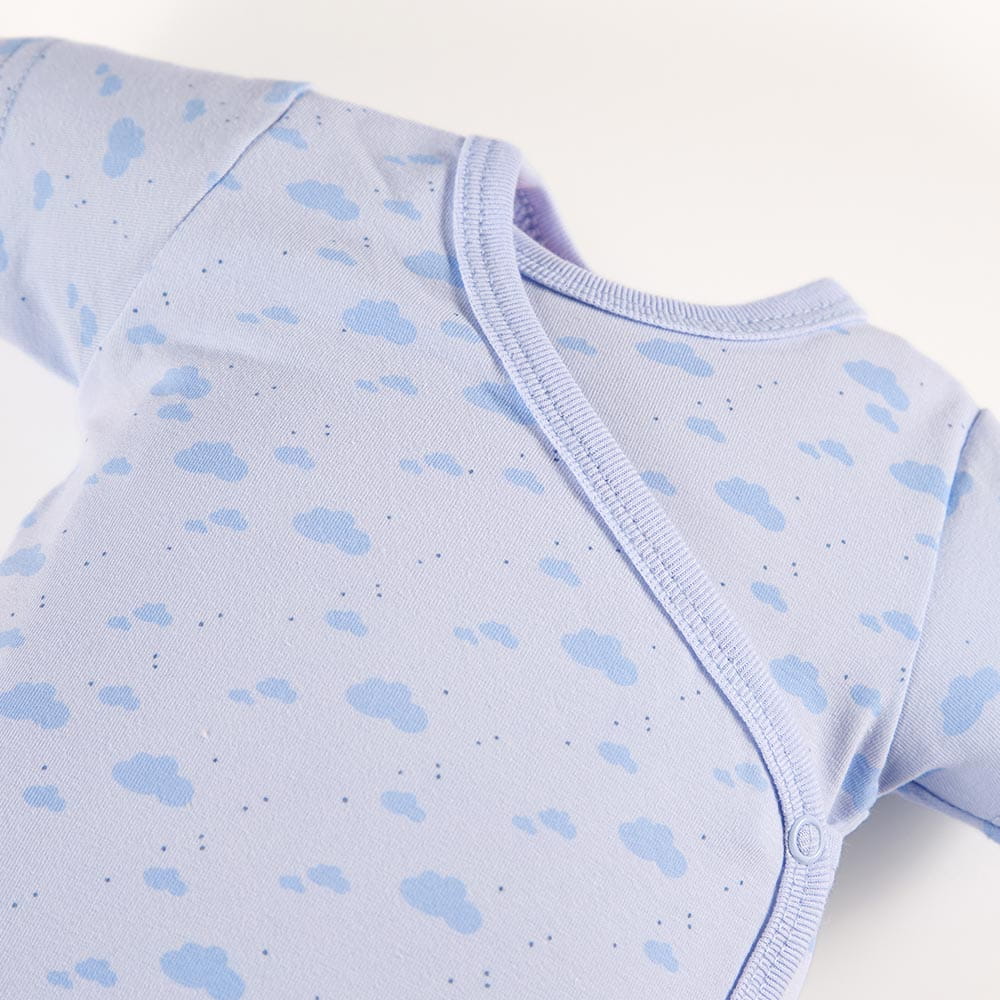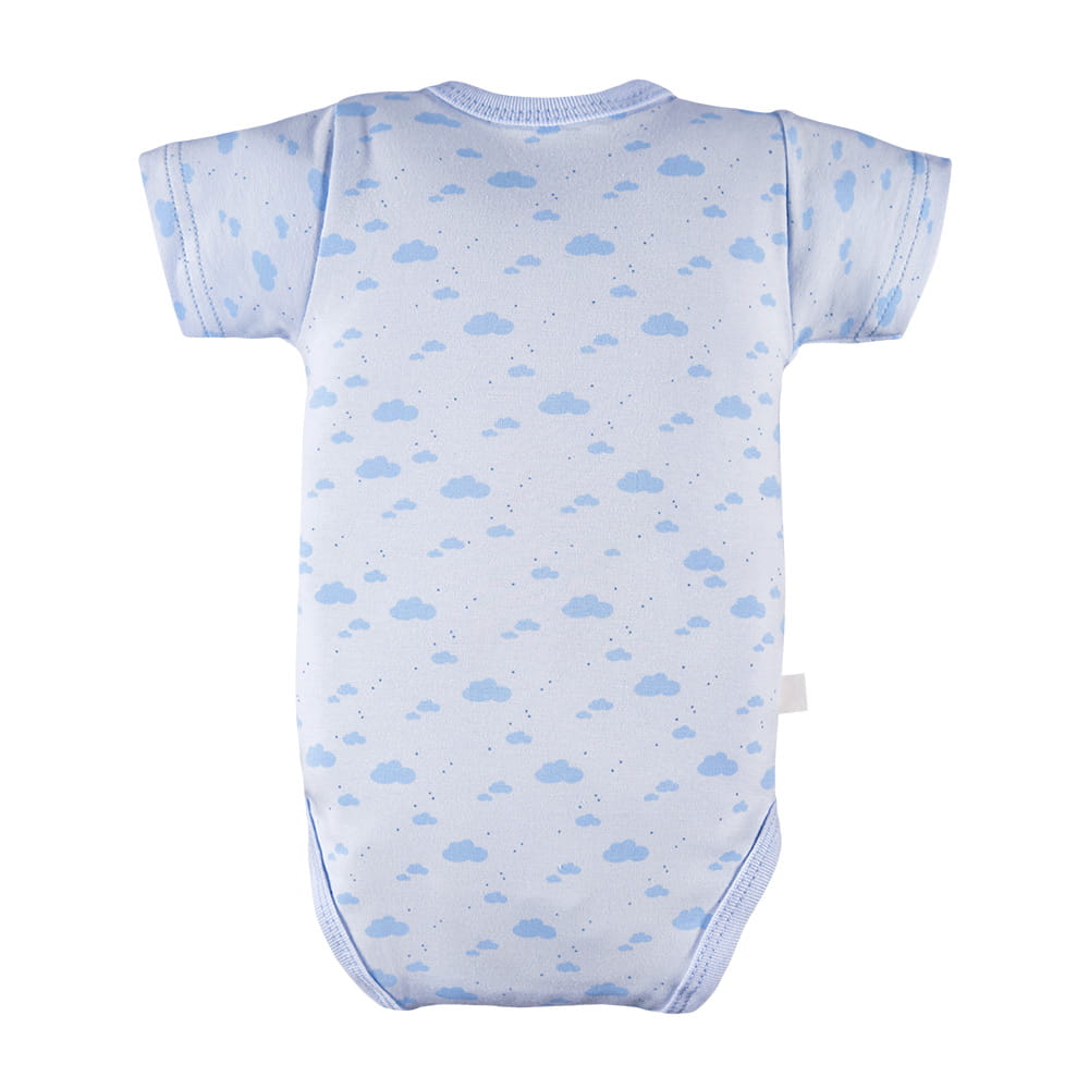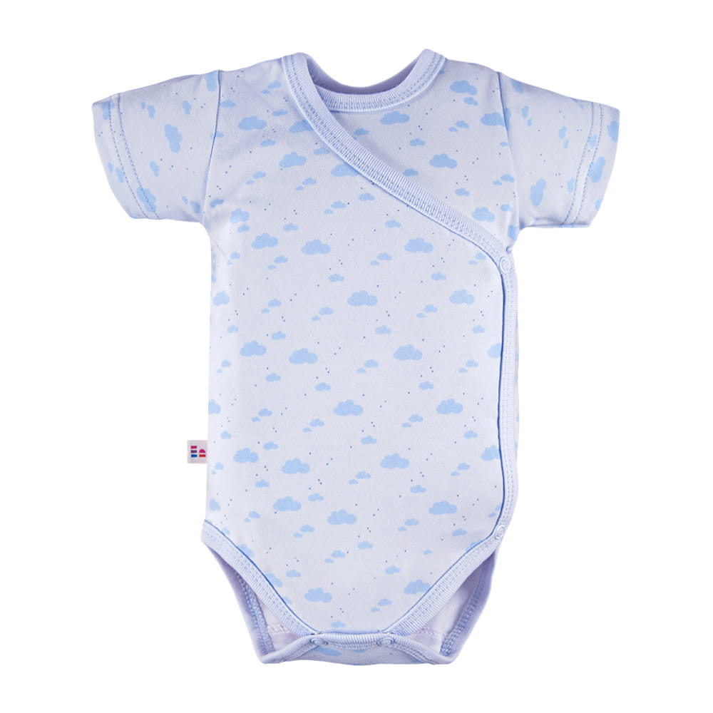 Niebieskie body kopertowe w chmurki z krótkim rękawem to wygodna i funkcjonalna propozycja dla niemowląt w pierwszych miesiącach życia. Delikatny wzór chmurek nadaje ubranku subtelny, dziecięcy charakter.