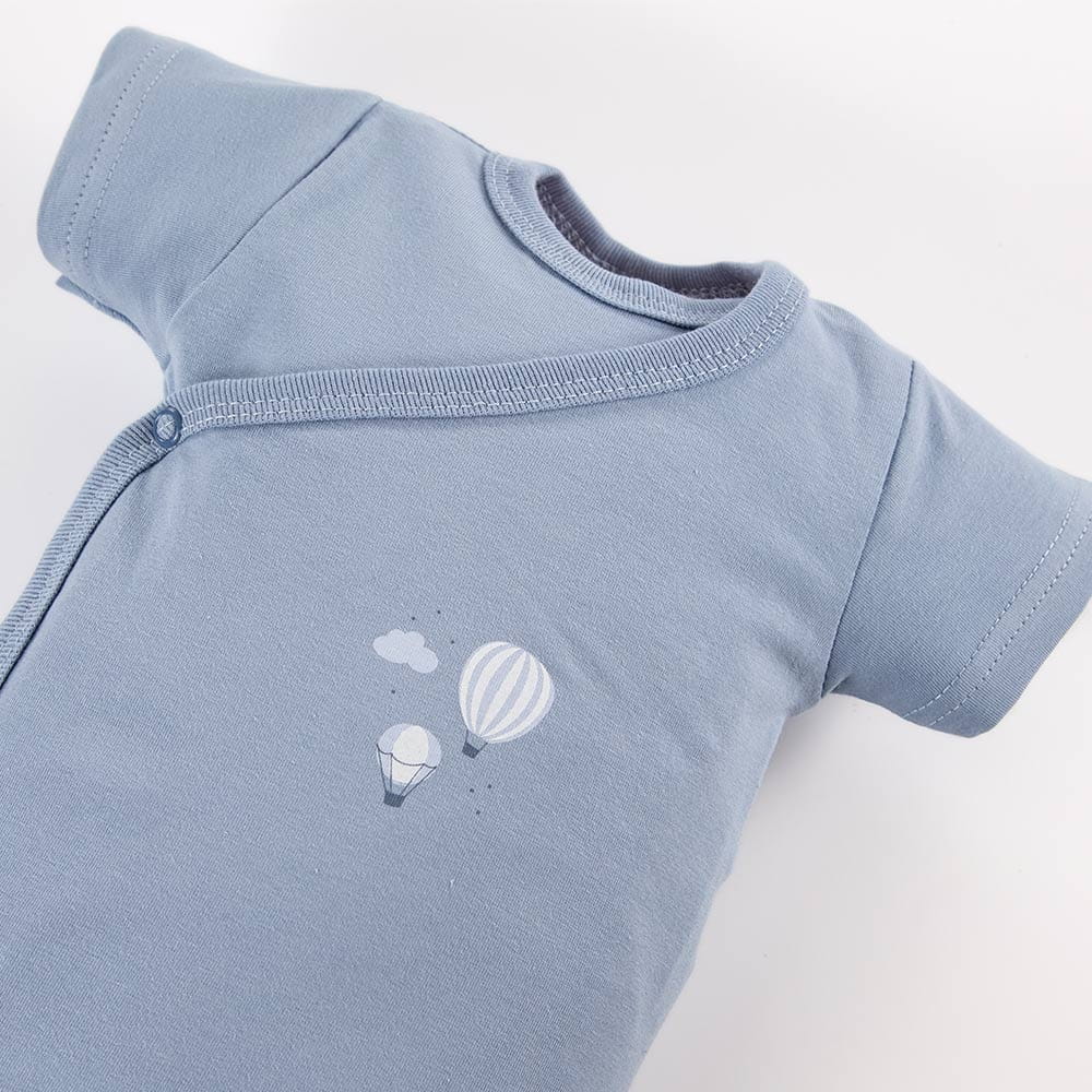 Niebieskie kopertowe body z krótkim rękawem to wygodna i funkcjonalna propozycja dla niemowląt w pierwszych miesiącach życia. Delikatny nadruk z motywem balonów nadaje ubranku subtelny, dziecięcy charakter.
