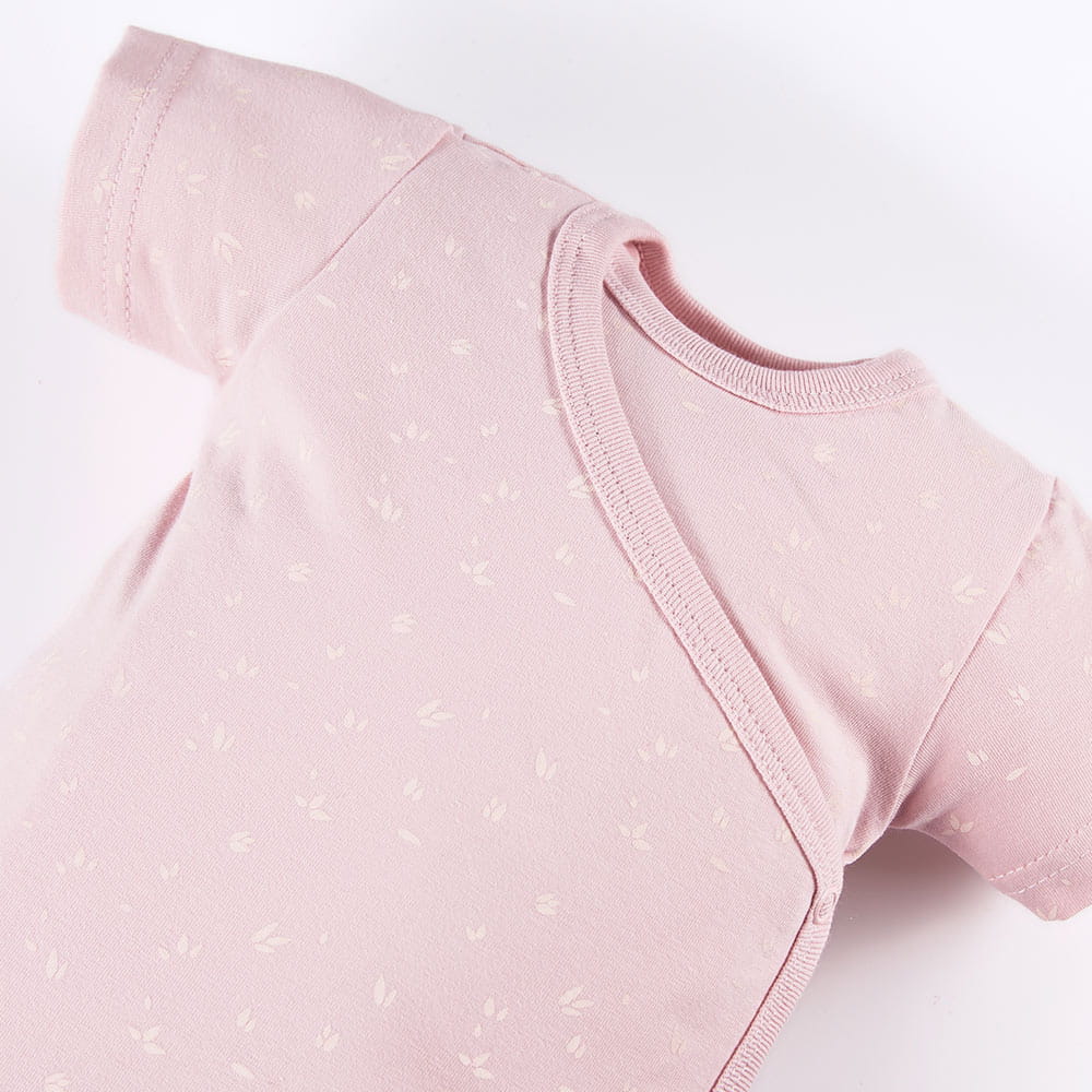 Różowe kopertowe body niemowlęce z krótkim rękawem w delikatny motyw kwiatuszków z kolekcji Petite to praktyczny i niezbędny element garderoby każdego maluszka. Subtelny wzór nadaje body uroczego, dziewczęcego charakteru.