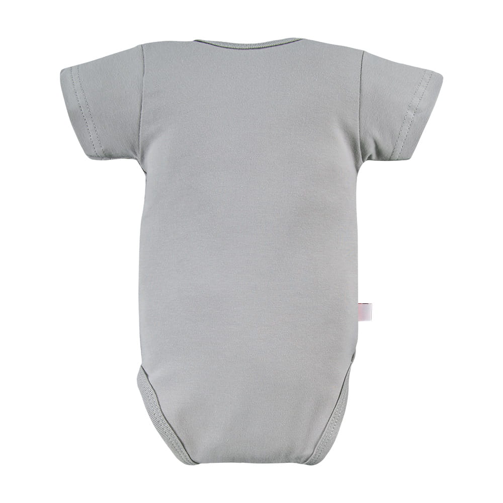Kopertowe body niemowlęce z krótkim rękawem w szarym kolorze z motywem gwiazdek to wygodna i funkcjonalna propozycja dla niemowląt w pierwszych miesiącach życia. Ozdobny nadruk z gwiazdkami nadaje ubranku subtelny, dziecięcy charakter.