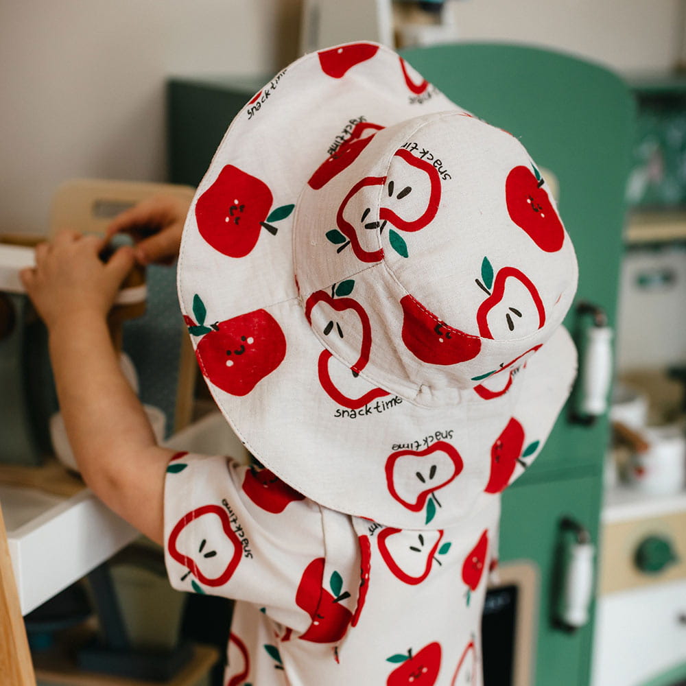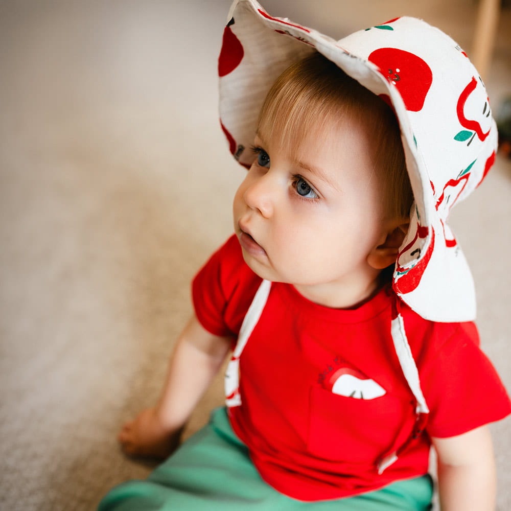 Miękki i przewiewny kapelusz dla dzieci wykonany w 100% z naturalnego, miękkiego bawełnianego muślinu. Kapelusz ma delikatny kolor ecru ozdobiony uroczym nadrukiem jabłuszek i jest wiązany pod bródką, co zapewnia wygodę i bezpieczeństwo podczas noszenia. Idealny na wiosnę i lato, zapewnia ochronę przed słońcem i komfort podczas zabawy na świeżym powietrzu.
