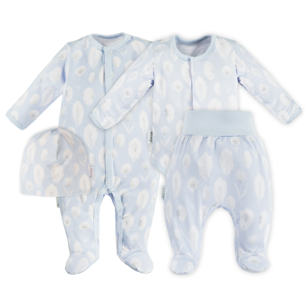 Zestaw bambusowy pajac, body, czapka i półśpiochy niebieskie w piórka – kolekcja Bamboo