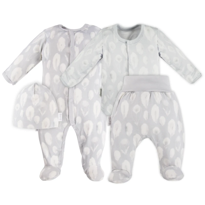 Zestaw bambusowy pajac, body, czapka i półśpiochy szare w piórka – kolekcja Bamboo