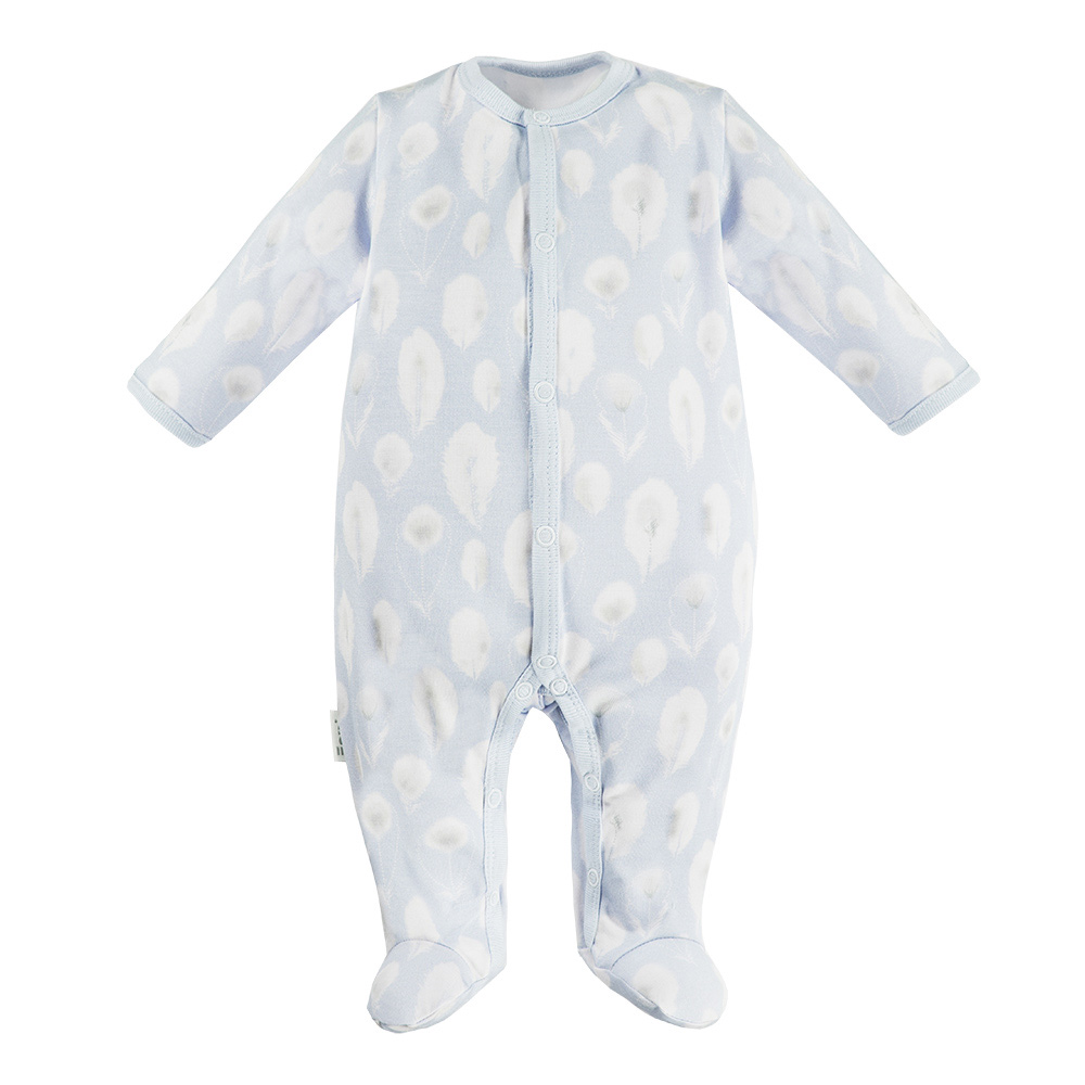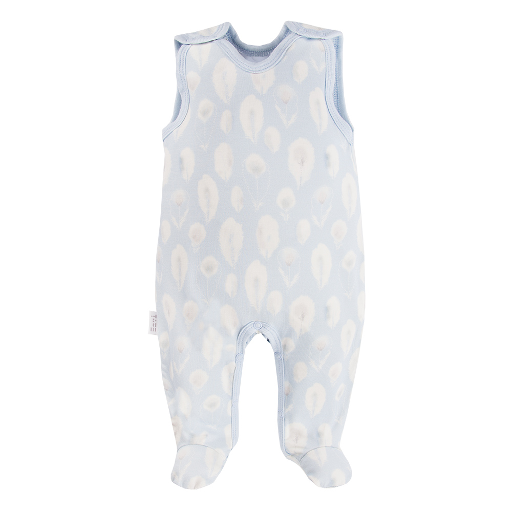 Komplet utrzymany jest w niebieskiej kolorystyce z uroczym wzorem piórek. Nadruk wykonany metodą cyfrową sprawia, że materiał pozostaje wyjątkowo miękki, a wzór nie jest wyczuwalny pod palcami.