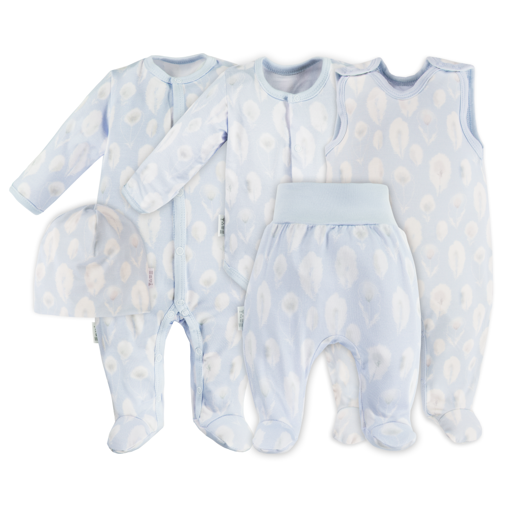 Zestaw bambusowy pajac, śpiochy, body, czapka i półśpiochy niebieskie w piórka – kolekcja Bamboo