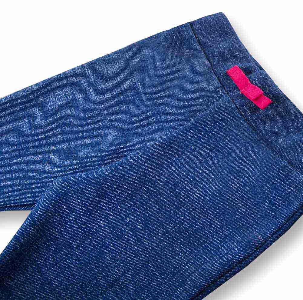 Spodnie wykonane są z miękkiej dzianiny imitującej jeans, co zapewnia komfort noszenia i pełną swobodę ruchów. Dodatkowym elementem ozdobnym jest różowa kokardka mocowana na gumce, która podkreśla dziewczęcy styl zestawu.